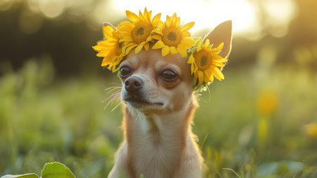 A charming Chihuahua dog adorned with a crown of sunflowers sits in a lush green field at sunset, showcasing beauty and tranquility in nature's setting.