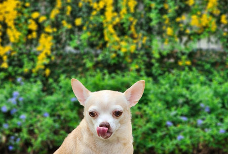 Close up image of brown short hair Chihuahua dog sitting in the garden with yellow flowers blackground, licking his lips.