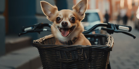 Chihuahua dog have fun bicycle ride on sunshine day morning in summer on town street