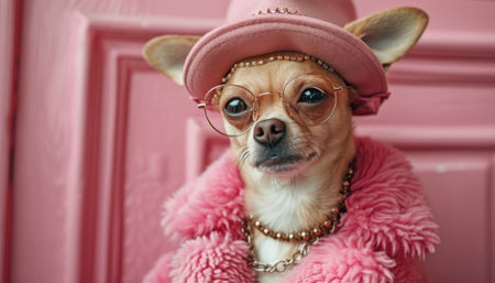 A small stylish dog in a pink fur coat and glasses, looking serious. Isolated on a pink background, posing for the camera.