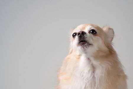 close up of white brown fur chihuahua 7 years old looking up with grey background and copy space at the left.