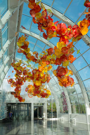 Seattle, Washington, USA, December, 15, 2015: Inside the incredible Chihuly atrium showing a beautiful blown glass artwork the resembles flowers and petals