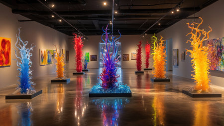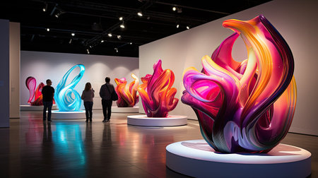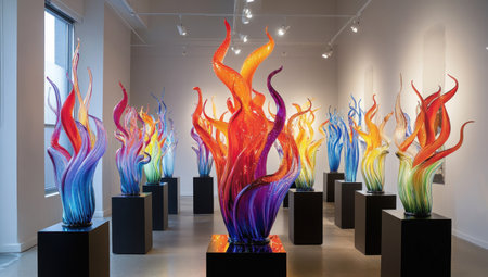An art gallery showcasing vibrant glass sculptures, each piece reflecting the dynamic colors and shapes of flames in an elegant display. The gallery's white walls create a stark contrast with the colorful glass pieces arranged on tall black stands. A central sculpture, reminiscent of flowing fire, is bathed in warm light from above, casting reflections across its surface and the surrounding environment. This scene captures the essence of modern artistic expression through sculptural forms. --ar 53:30 --v 6.1 Job ID: b9728ab6-dba1-4c34-9faf-9b3c796999f4