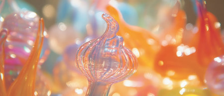 Close-up of a vibrant glass sculpture with swirling patterns and rich colors, capturing intricate details and light reflections.