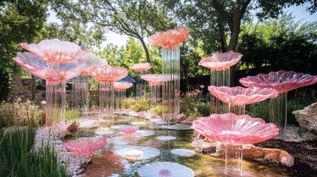 Stunning pink glass flowers emerge from a peaceful pond, framed by vibrant foliage and soft petals, evoking a sense of calm and artistic beauty, AI generated