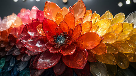 A vibrant, multi-colored flower sculpture composed of transparent, leaf-shaped petals. The center features a faceted gem.