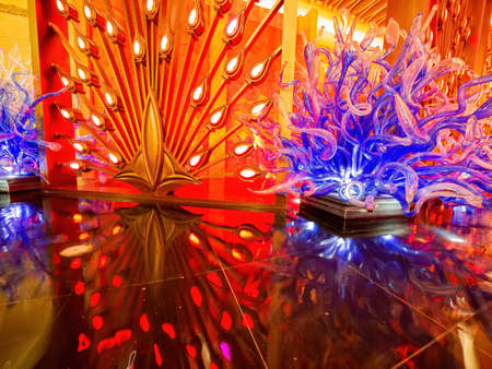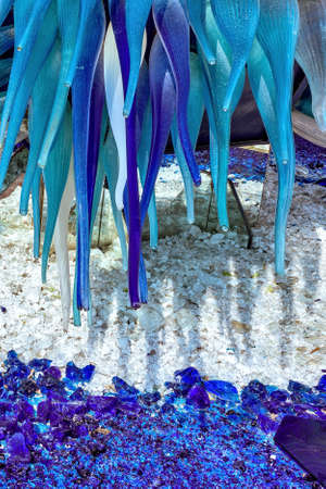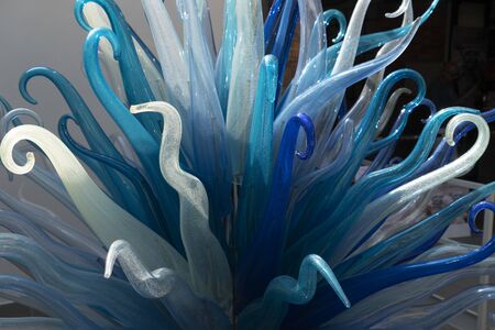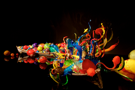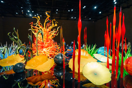 SEATTLE, WASHINGTON, USA - JAN 23rd, 2017: Blown glass in abstract shapes, Ikebana and Float Boat exhibit by American artist Dale Chihuly at Chihuly Garden and Glass Museum