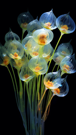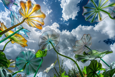 A bunch of glass flowers are in the air, with some of them being green and others being yellow. The sky is blue and cloudy, creating a moody atmosphere