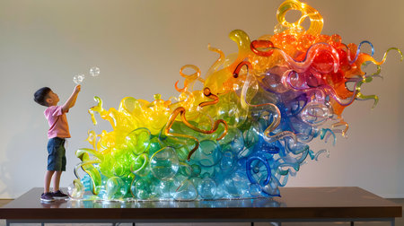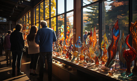 An art gallery with vibrant glass sculptures and abstract paintings, showcasing the colors of flames in an array of reds, oranges, yellows, blues, purples, and greens, reflecting on polished concrete floors under bright overhead lighting. The mood is one of awe and wonder as visitors marvel at these intricate pieces of modern sculpture, creating a visually stunning atmosphere that captures the essence of creativity and artistic expression. --ar 53:30 --v 6.1 Job ID: bb3fd964-d2af-4e8c-b0e9-c772cde368a3