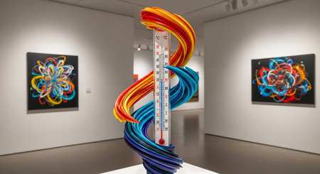 Inside a well-lit gallery, a striking contemporary sculpture of a thermometer stands prominently. The glass thermometer is encased and intertwined with vibrant, colorful, swirling in shades of red, yellow, blue, and orange, creating a dynamic and abstract form. Two abstract paintings with similar colorful, energetic patterns hang on the white walls in the background. The sculpture is presented on a white pedestal, highlighting its artistic merit and visual impact.