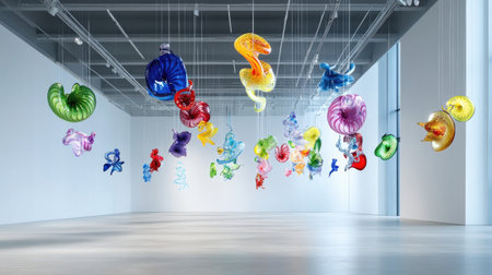 A stunning display of colorful glass sculptures suspended in a spacious modern art gallery creates a captivating visual experience for all visitors.