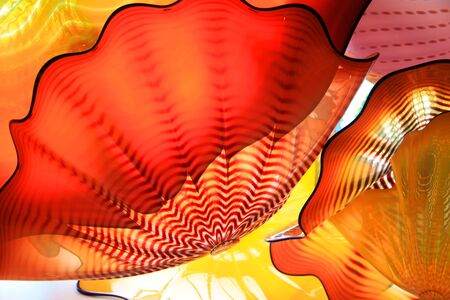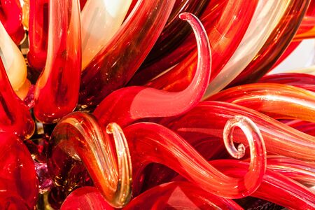 SEATTLE, WASHINGTON, USA - JAN 23rd, 2017: Blown glass in abstract shapes of flowers in red and yellow, Exhibit by American Artist Dale Chihuly at Chihuly Garden and Glass Museum