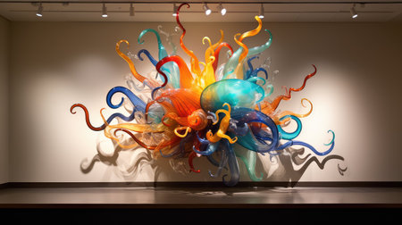 A vibrant, multi-colored glass sculpture with intricate swirling tendrils displayed in a dimly lit gallery.