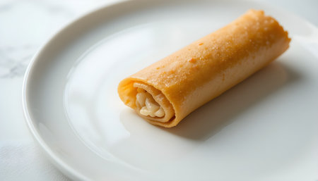 A delicate crepe filled with cream rests upon a white plate in a minimalist presentation.