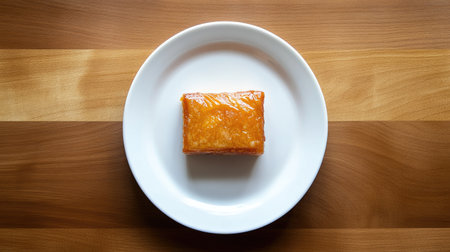 An inviting golden pastry sits elegantly on a white plate, highlighting its enticing texture and rich color against a warm wooden backdrop, perfect for food lovers.