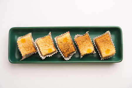 Top view a square-cut of sweet potato cake on a white plate in the kitchen. Bakery and beverage concept.