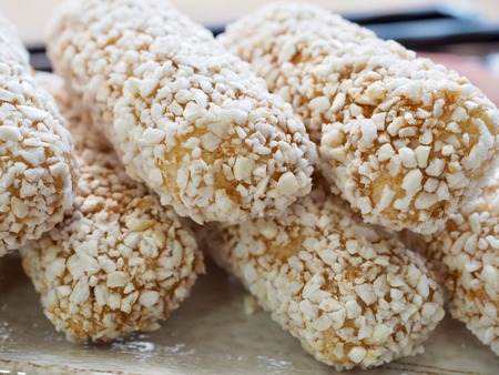 Gold candy rolls Thai sweetmeat made of flour coconut milk and egg call Tong Muan in Thai.