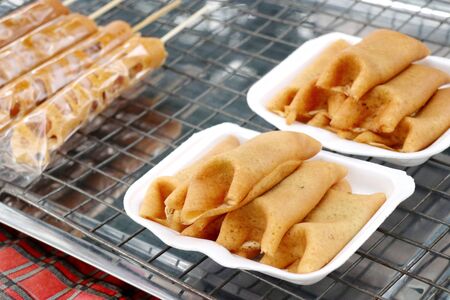 Thai traditional pancake with custard or egg call Kanom tokyo, thai sweet pancake famous for street food that is cheap,thin flat pancake filled with pork or sausage. perfect dessert for everyone