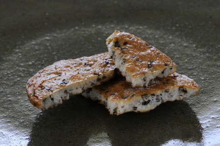closeup the red brown color frayed bread hold hand over out of focus grey background.