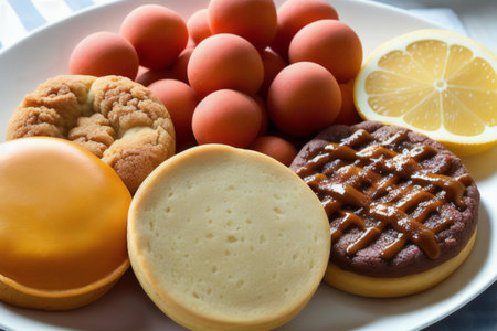 Close up of a plate full of homemade cookies, eggs and lemon. generative ai