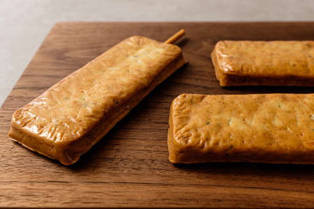 Tempeh, Tempe Goreng or Fried tempeh is Indonesia traditional food, made from fermented soybean seeds wrapped in banana leaves. Salty and savory, served as a side dish or snack. Served on plate.