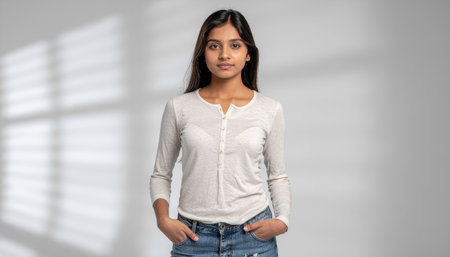 Portrait of cheerful friendly indian woman smiling, looking pleased, isolated over studio background. Happy person in traditional attire having positive facial expression, feeling satisfied, camera A