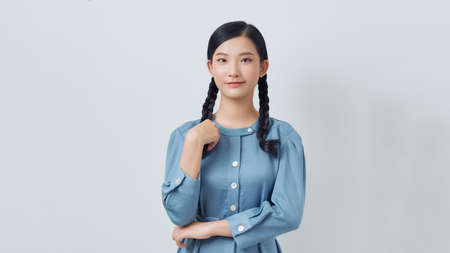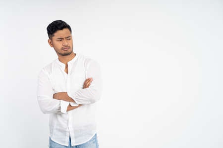 Portrait of unsatisfied asian woman standing with arms folded isolated over white background