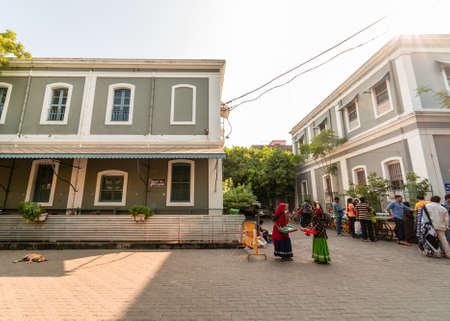 Pondicherry. India - February 2020: A tourist street lined with old French architecture in the city of Pondicherry.