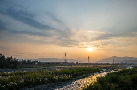 urban sunset scenery with electronic tower under colorful sky at Puli township, Nantou, Taiwan