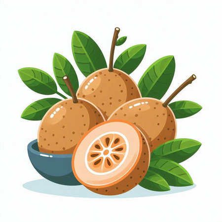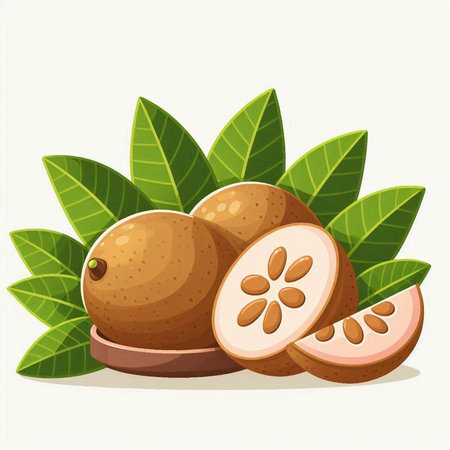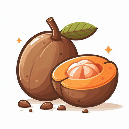 Illustration of whole and half of Sapodilla. Vector illustration.