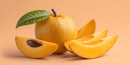A large, round, golden-yellow lucuma fruit is centerpiece surrounded by several thick wedges showing its smooth orange flesh and prominent brown seed. Single dark green leaf accents this nutritious subtropical specimen displayed on warm beige setting.