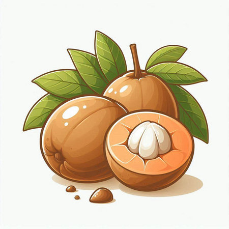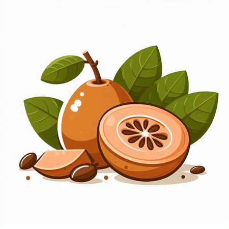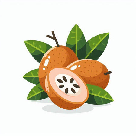 Sapodilla fruit with green leaves. Vector illustration isolated on white background.