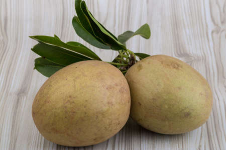 fresh sapodilla fruits on old wooden background. tropical fruits concept