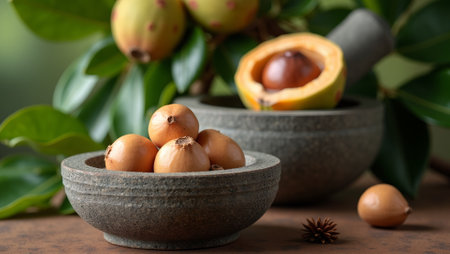 Fresh whole nutmeg on stone mortar with split nutmeg fruit and tree in background