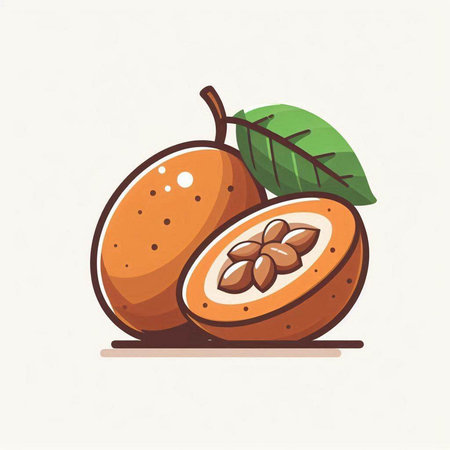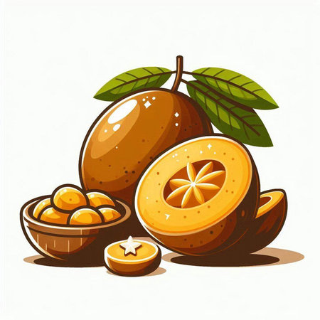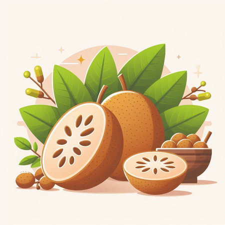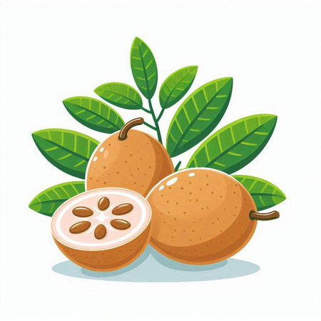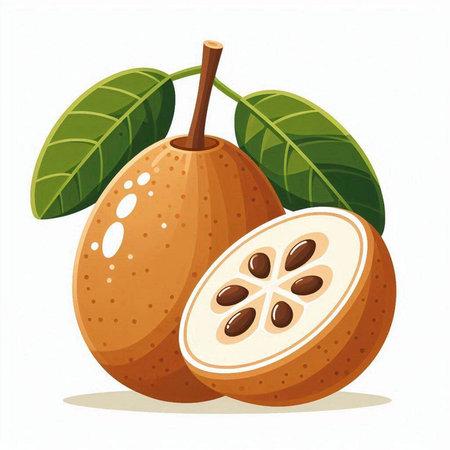 Whole and half ripe sapodilla with leaves. Vector illustration.