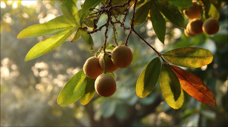 Sweet fruit tree branch. Summer tropical fruits in an organic farm. Green leaves in background. Back lit by sunset sunlight in summer evening.