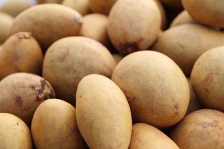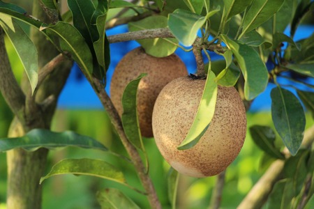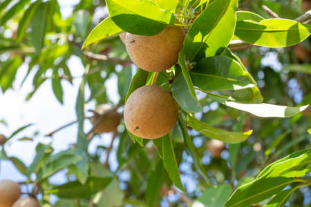 Sapodilla fruit (Manilkara zapota) and other names such as sapota, chikoo, chico, naseberry, or nispero. Sapodilla is tropical fruit evergreen tree and sweet taste fruit