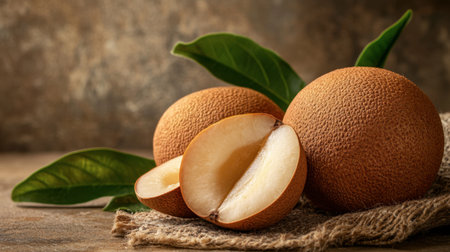 A whole sapodilla fruit on a sand tone background, warm and rustic.