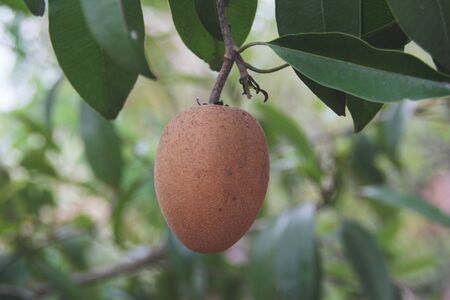 Manilkara zapota is the Latin name of the sapodilla manilla fruit, this brown fruit grows a lot in Southeast Asia, including in Indonesia. selective focus on leaves and fruit