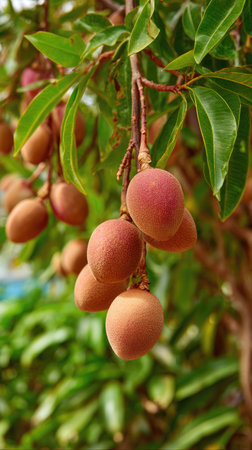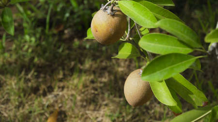Manilkara zapota fruit growing on the tree close up view