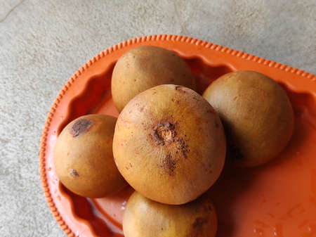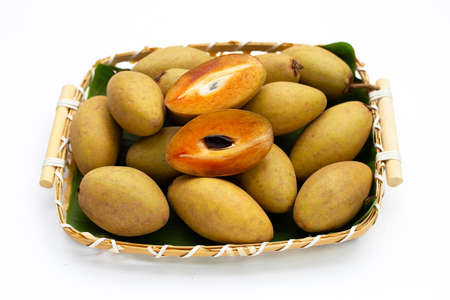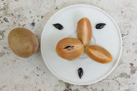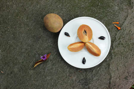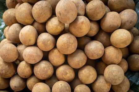 Sapodilla fruit (Manilkara zapota) and other names such as sapota, chikoo, chico, naseberry, or nispero. Sapodilla is tropical fruit evergreen tree and sweet taste fruit