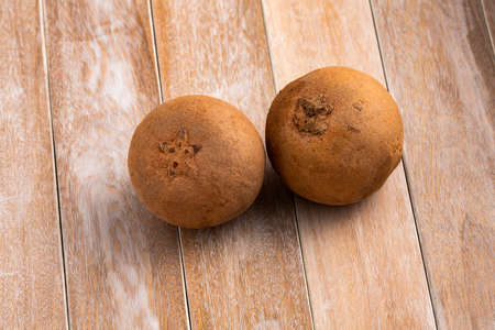 fresh sapodilla fruits on old wooden background. tropical fruits concept