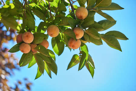 Nutmeg or muscat nuts growth on the tree under a sunny day