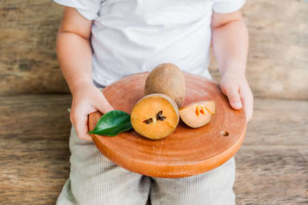 Hands holding a board with fresh sapodilla fruits on old wooden background. tropical fruits concept