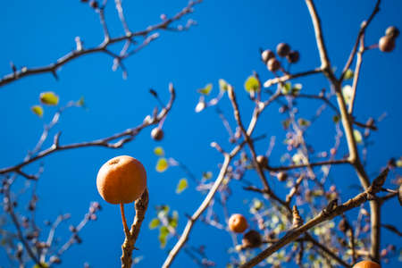 Fall foliage in the south a brown nut on a tree on a blue sky background