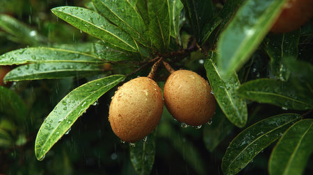 Sapodilla in gentle light rain, soft raindrops visible on vivid green leaves, natural realistic style, bright fresh colors, balanced wide composition, cinematic framing, highly detailed, seamless for video continuation.