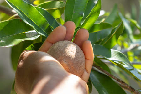 A raw Sapodilla fruit on the sapodilla tree plant, Manilkara zapota.