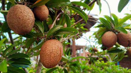 Sapodilla as the local balinese kiwi growth on the tree with brown skin fruit color