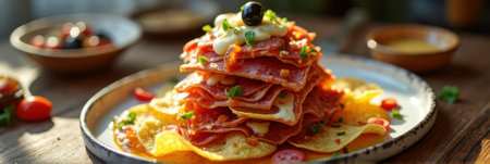Delicious stacked nachos with pepperoni, cheese, and olives on rustic plate. That the image is generated using AI.
