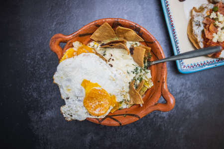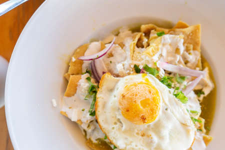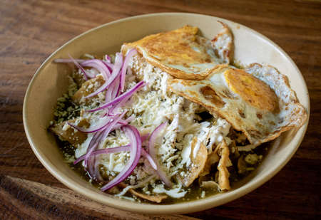 Mexican food: tasty green chilaquiles with fried egg, onion and panela fresh cheese